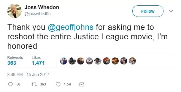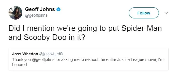 "Gracias @geoffjohns por pedirme que vuelva a filmar toda la película de la Liga de Justicia, estoy honrado."