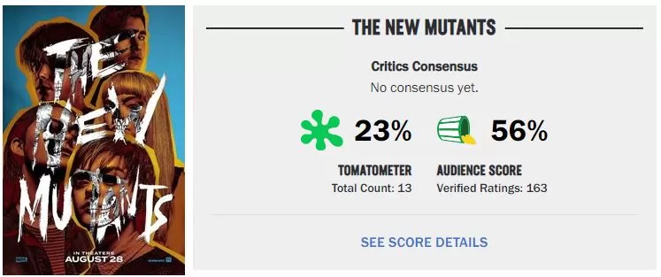 Sin embargo, a pesar que resultaba ser un título tal vez no tan grande como otras entregas mutantes, la expectativa respecto a 'Los Nuevos Mutantes' fue creciendo y recientemente se vio envuelta en cierta polémica pues los periodistas norteamericanos no habían podido reseñar la cinta debido a que Disney no dio las facilidades del caso (no hizo screenings especiales ni envió la película de manera digital). No obstante, Rotten Tomatoes ya puede ofrecer las primeras críticas y una calificación otorgada tanto por críticos como audiencia.