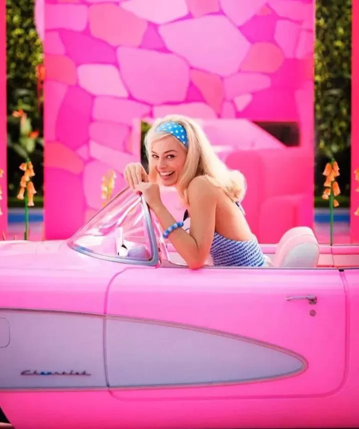 En su clásico descapotable rosa, Margot Robbie luce radiante como Barbie, con un aspecto vintage que nos devuelve a los 60s o 70s. En este primer vistazo, vemos a la actriz llevar un top de cuello halter con rayas azules y blancas, complementado con una diadema de puntos y un brazalete de cuentas gruesas.