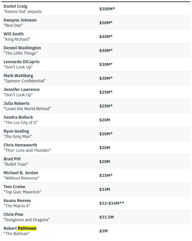 De acuerdo a una extensa nota en la que revelan algunos de los salarios más jugosos de la industria del cine, al final de la tabla figura Robert Pattinson y su salario de 'The Batman' por $3 millones. En la parte superior de la lista se encuentra Daniel Craig por las secuelas de 'Entre Navajas y Secretos' para Netflix, por las que habría cobrado unos $100 millones, seguido de Dwayne Johnson que cobró $50 millones 'Red One', de Amazon Studios.