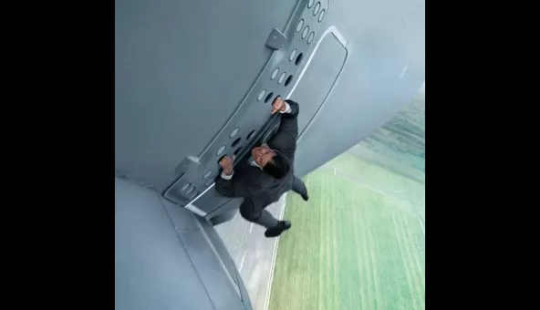 ...y gracias a un video que nos muestra escenas detrás de cámaras de su última cinta, sabemos que las tomas de Tom colgando del avión, son en efecto, verdaderas. Nada de pantalla verde ni un avión volando bajito, nada de eso. El avión despegó del suelo por varios, varios metros para darle autenticidad a la toma.