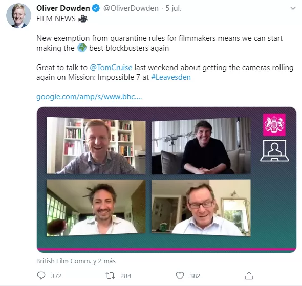 Entre las producciones que están próximas a rodar se encuentran 'The Batman', 'Jurassic World: Dominion', 'Animales Fantásticos 3' y la séptima entrega de 'Misión Imposible'. De hecho, el secretario de Cultura, Oliver Dowden, se comunicó con el mismo Tom Cruise sobre los alcances de estas nuevas medidas para el sector y muy entusiasta lo compartió en sus redes sociales.