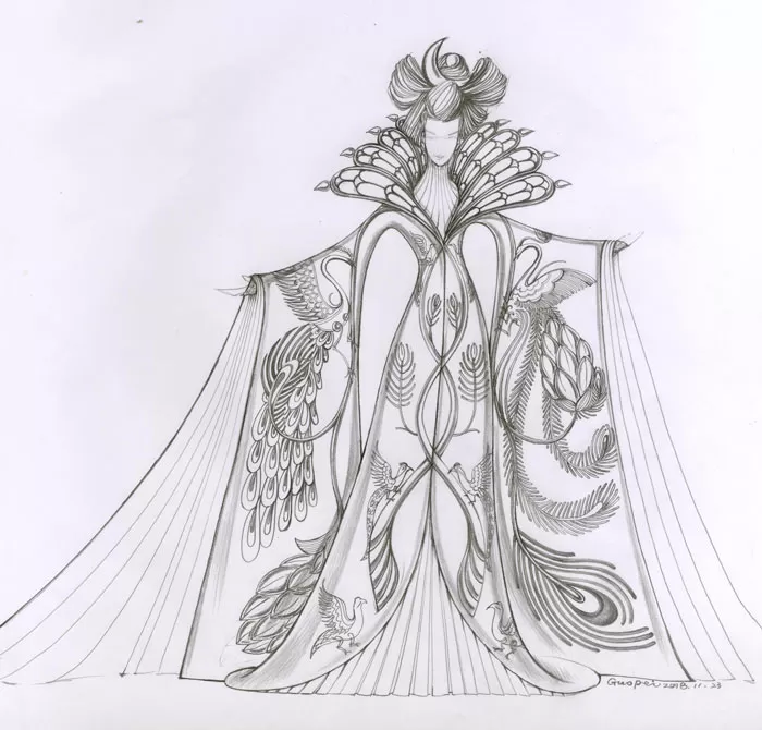 "Creo que Guo Pei ve el diseño de vestuario como un ejemplo de narración dramática. Con un brillo en los ojos, ella diseña formas, colores y telas que sorprenden a una desprevenida audiencia. A menudo, su forma de contar historias queda bordada en sus creaciones. La bata real de Chang’e cuenta la historia de su amor por Houyi mediante el dibujo de dos aves exóticas entrelazadas. Ella diseñó una imagen de Houyi como un arquero frente al sol, pero lo puso en la espalda de la bata, para que quede para siempre escondido de los ojos de Chang’e. Un detalle muy conmovedor. Todos esperábamos con ansias la llegada de cada diseño nuevo de Guo Pei” - termina Keane.