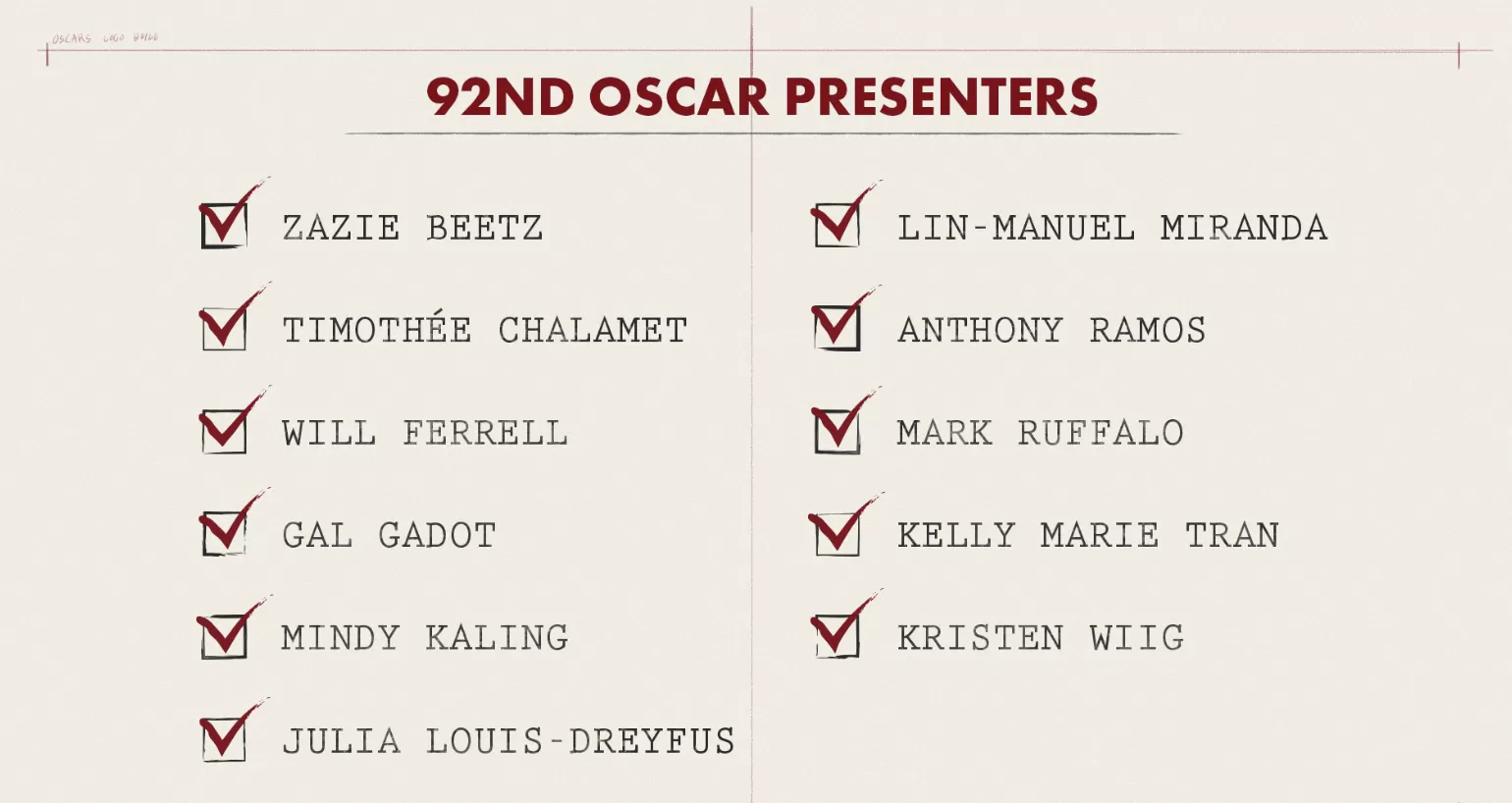 Entre ellos están los ganadores del Oscar del 2019, Mahershala Ali, Olivia Colman, Regina King y Rami Malek, quienes presentarán a los ganadores en sus propias categorías este año.