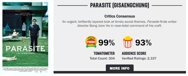 Si eres fan del cine independiente, seguramente has escuchado hablar de "Parasite" del director Bong Joon-ho, la cinta surcoreana que ha conquistado a la crítica y cinemeros y que se alzó como la gran ganadora del pasado Festival de Cine de Cannes. Este drama lleno de suspenso y con muchos toques de humor negro ha logrado amasar unos impresionantes $114 millones a nivel mundial, de un presupuesto aproximado de solo $11 millones y por si sus cifras de recaudación no te terminan de convencer, chequea las excelentes calificaciones que ha recolectado: