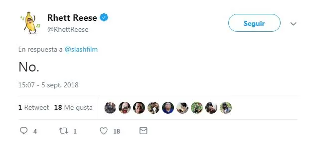 Sin embargo, ante tanta emoción de los fieles seguidores del actor y director, Rhett Reese, el guionista de la historia, desmintió el rumor en twitter con un simple “no”.