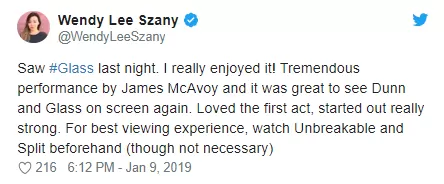 “Vi #Glass anoche. ¡Realmente lo disfruté! Tremenda actuación de James McAvoy y fue genial ver a Dunn y Mr. Glass de nuevo en la pantalla. Me encantó el primer acto, comenzó muy fuerte. Para una mejor experiencia de visualización, vea El Protegido y Split de antemano (aunque no es necesario)”.