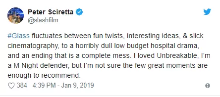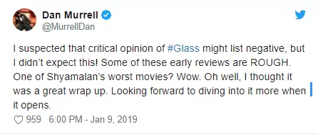 “Sospeché que la opinión crítica de #Glass podría ser negativa, ¡pero no esperaba esto! Algunos de estos primeros comentarios son duros. ¿Una de las peores películas de Shyamalan? Guau. Oh bueno, pensé que era un gran resumen.”