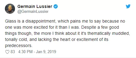 “Glass es una decepción, me duele decirlo porque nadie estaba más emocionado por la cinta que yo. Sin embargo, a pesar de algunas cosas buenas, cuanto más lo pienso, se trata de una confusión temática, de un tono frío y carente del corazón o la emoción de sus predecesoras.”