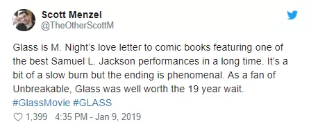 “Glass es la carta de amor de M. Night a los cómics con una de las mejores actuaciones de Samuel L. Jackson en mucho tiempo. Es un poco lenta, pero el final es fenomenal. Como fan de El Protegido, Glass valió la pena la espera de 19 años.”