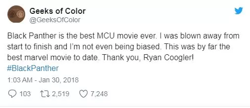 Geeks of Color escribió que "Pantera Negra" es la "mejor película de la historia" y que fue "la mejor película de Marvel hasta la fecha".