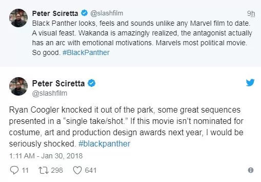 Peter Sciretta de SlashFilm dijo que "Pantera Negra" se ve, se siente y suena diferente a cualquier película de Marvel hasta la fecha "y la llamó la película más política". Sciretta predijo que la película será nominada para vestuario, arte, y premios de diseño de producción.