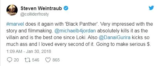 Steven Weintraub de Collider dijo que estaba "muy impresionado con la historia. [Michael B. Jordan] lo mata absolutamente como el villano y es el mejor desde Loki".