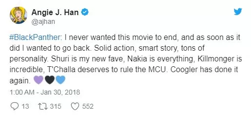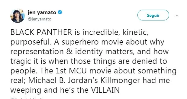 Jen Yamato de Los Angeles Times lo llama "increíble, decidida. Una película de superhéroes sobre por qué importa la representación y la identidad, y lo trágico que es cuando se le niegan esas cosas a la gente. La [primera] película de UCM sobre algo real; El Killmonger de Michael B. Jordan me hizo llorar y él es el VILLANO".