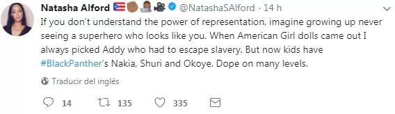 Natasha Alford de The Grio escribió que los "matices y detalles en la historia de #PanteraNegra son impecables. No me sentí complacido, estereotipado o apagado. Me sentí con un orgullo increíble en todo momento y eso que son personajes de ficción”.