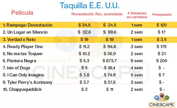 La que ha sorprendido con su debut es Verdad o Reto, la cinta de Blumhouse protagonizada por Lucy Hale (Pretty Little Liars) que fue el segundo mejor estreno de la semana con $19 millones. Interesante ver la cifra porque solo costó $3.5 millones en realizarla y con ello ya pagó todas las cuentas y dejó ganancias más que decentes. Lo que sí no la va a favorecer es el boca a boca porque la audiencia de Rotten Tomatoes le otorga 21% mientras que los críticos le dan un puntaje aún más bajo con 15%. Por aquí llega el 3 de mayo.