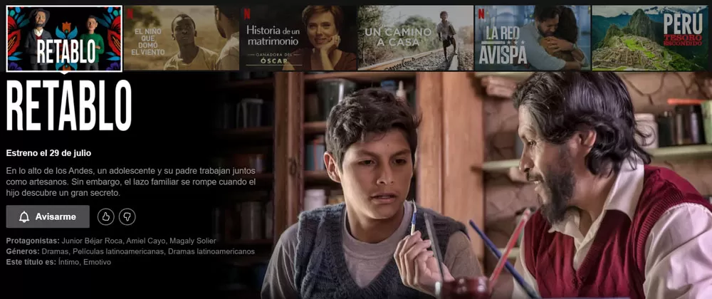 ¡Qué orgullo! La película nacional "Retablo", ganadora de más de 50 premios en competencia internacional y que incluso compitió por un Premio BAFTA, es el siguiente largometraje nacional en sumarse a la gran plataforma de Netflix este 29 de julio. El día de hoy se dio a conocer la noticia y la cuenta oficial de la película no dudó en compartir la alegría de este anuncio.