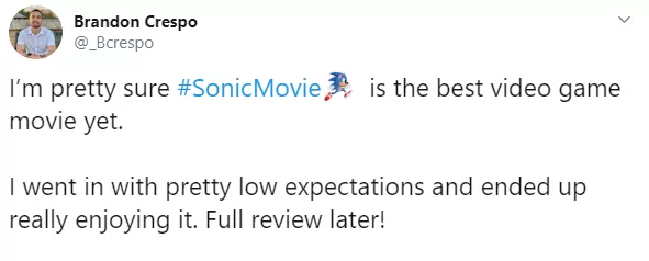 Estoy bastante seguro de que #SonicMovie es la mejor película de videojuegos hasta ahora. Entré con expectativas bastante bajas y terminé disfrutando mucho. Crítica completa más tarde!