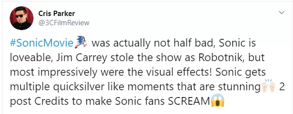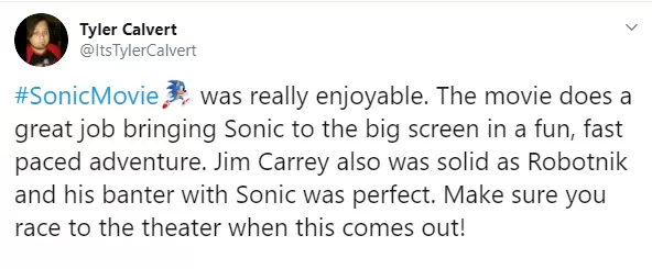 #SonicMovie fue realmente agradable. La película hace un gran trabajo llevando a Sonic a la pantalla grande en una aventura divertida y de ritmo rápido. Jim Carrey también fue sólido como Robotnik y sus bromas con Sonic fueron perfectas. ¡Asegúrate de ir al cine cuando salga esto!