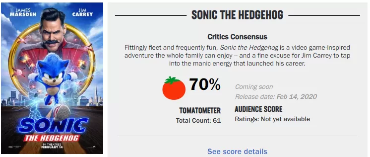 “Sonic the Hedgehog es una aventura inspirada en los videojuegos que toda la familia puede disfrutar, y una buena excusa para que Jim Carrey aproveche la energía maniática que lanzó su carrera”, la película actualmente tiene un 70% de aprobación en el indexador de críticas considerando 61 reseñas.