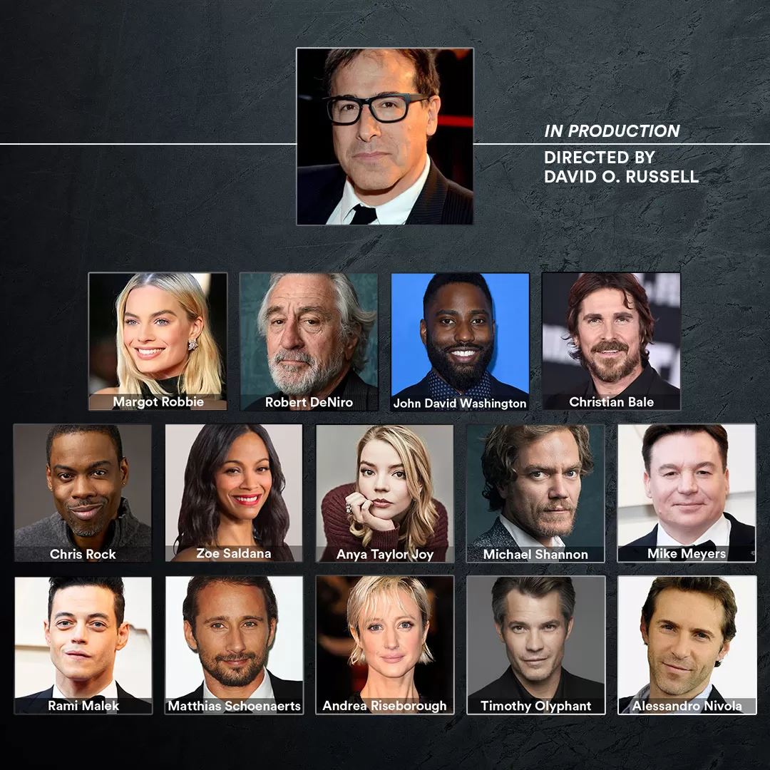Si bien todavía no sabemos mucho sobre el próximo largometraje de David O. Russell para New Regency, desde ya, la fuente Deadline ha confirmado que Robert De Niro, Mike Myers, Timothy Olyphant, Michael Shannon, Chris Rock, Anya Taylor-Joy, Andrea Riseborough, Matthias Schoenaerts y Alessandro Nivola se han unido recientemente al proyecto, encabezado por Christian Bale, Margot Robbie, John David Washington, Rami Malek y Zoe Saldana, quienes también protagonizarán el proyecto sin título, basada en una idea original del cineasta cinco veces nominado al Oscar.