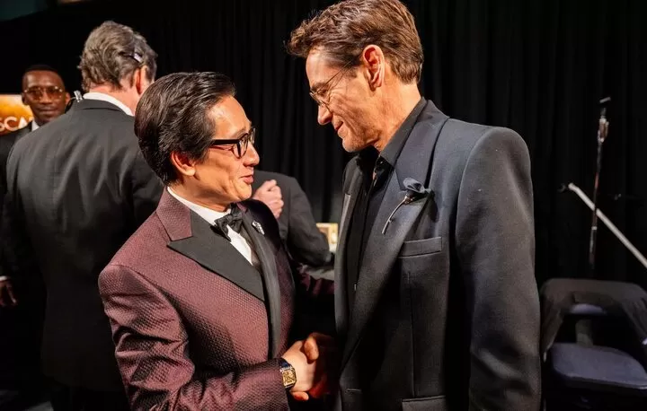 Esto me lo perdí, que horrible gesto de Robert Downey Jr, ignoró completamente al siempre adorable y gentil Ke Huy Quan, recibió el premio sin voltear a mirarlo y saludarlo. 👎👎 bájate de tu nube #Oscars pic.twitter.com/helzxM30xU