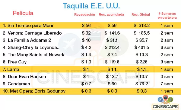Debido a que se trata del fin de la era Craig, las proyecciones apuntaban a que 'Sin Tiempo para Morir' logre estar en el rango de los $80 millones para su primer fin de semana, sin embargo, no logró igualar las expectativas. Tomando en cuenta los elevados costos de producción, que ascienden a $250 millones, aún le quedan varios millones por recaudar para que este título logre reportar ganancias para su estudio.