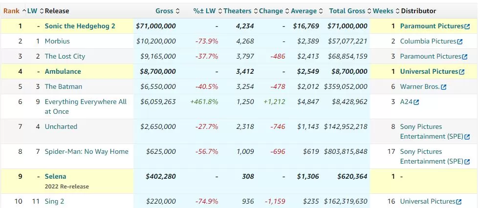 En contraparte a esta secuela de Sonic que arrasó con la preferencia de los cinemeros, 'Morbius' cayó al segundo lugar de recaudación pero sumando únicamente $10 millones de dólares, poco para tratarse de su segunda semana. Hasta el momento el título de Sony Pictures obtiene un total de $126 millones de dólares, de los cuales $57 millones pertenecen únicamente a territorio norteamericano.