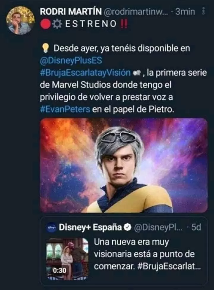 En enero de este año, poco después del lanzamiento del primer episodio de 'WandaVision', el actor de doblaje español Rodri Martín confirmó a través de Twitter que volvería para ponerle la voz a Evan Peters como Pietro Maximoff, cuando la participación del personaje era una de las sorpresas de la temporada.
