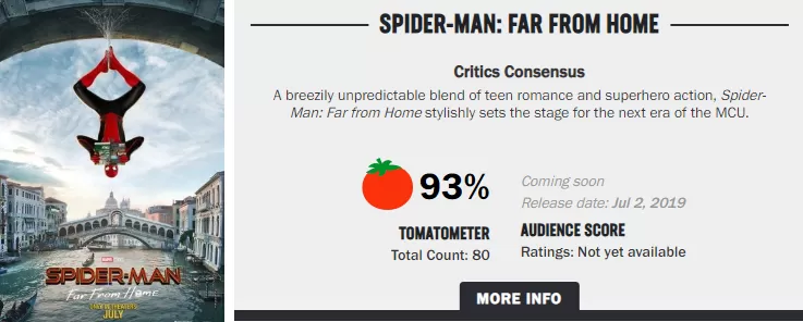 ‘Spider-Man: Lejos de Casa’ ha debutado con un 93% de aprobación, considerando 80 reseñas. En el actual panorama, esta película se ubica 1% por encima de ‘Spider-Man: Homecoming’ y comparte la misma aprobación que ‘Spider-Man 2’ de Sam Raimi.