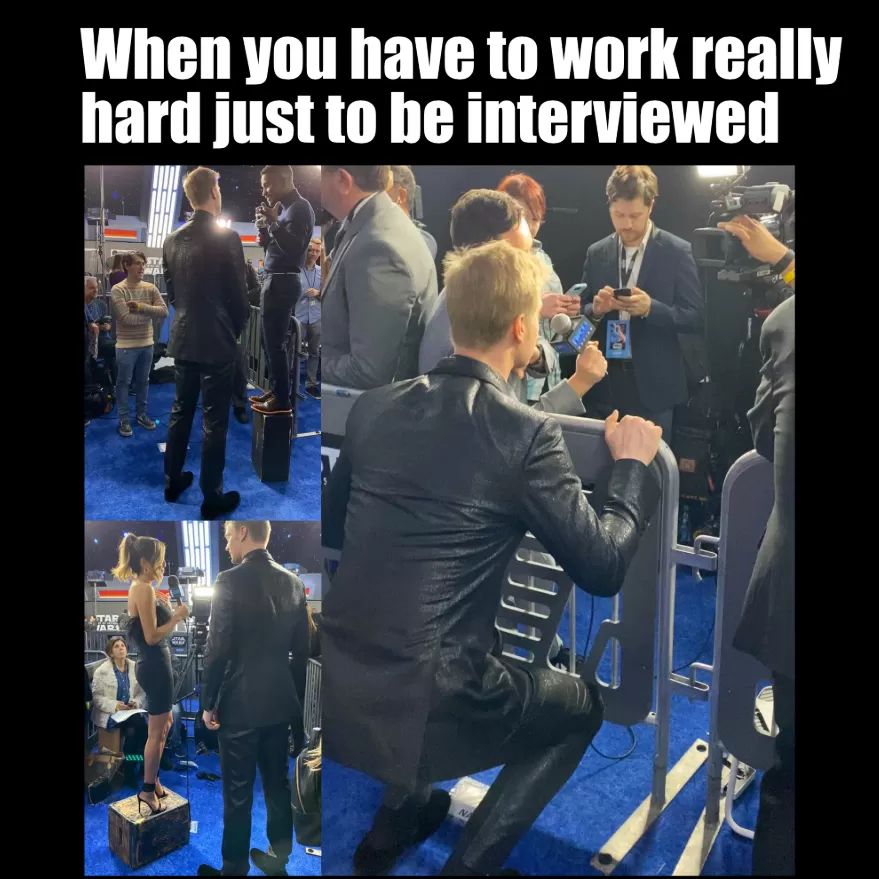 Las imágenes muestran al actor arrodillado para una entrevista o a los entrevistadores parados en cajas.