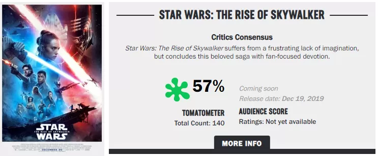 Al momento de escribir esta nota, el sitio ha acumulado 140 críticas y con esos datos ha formado un consenso crítico. Ese consenso dice lo siguiente: ‘Star Wars: El Ascenso de Skywalker’ sufre de una frustrante falta de imaginación, pero concluye esta querida saga con una devoción centrada en los fanáticos".