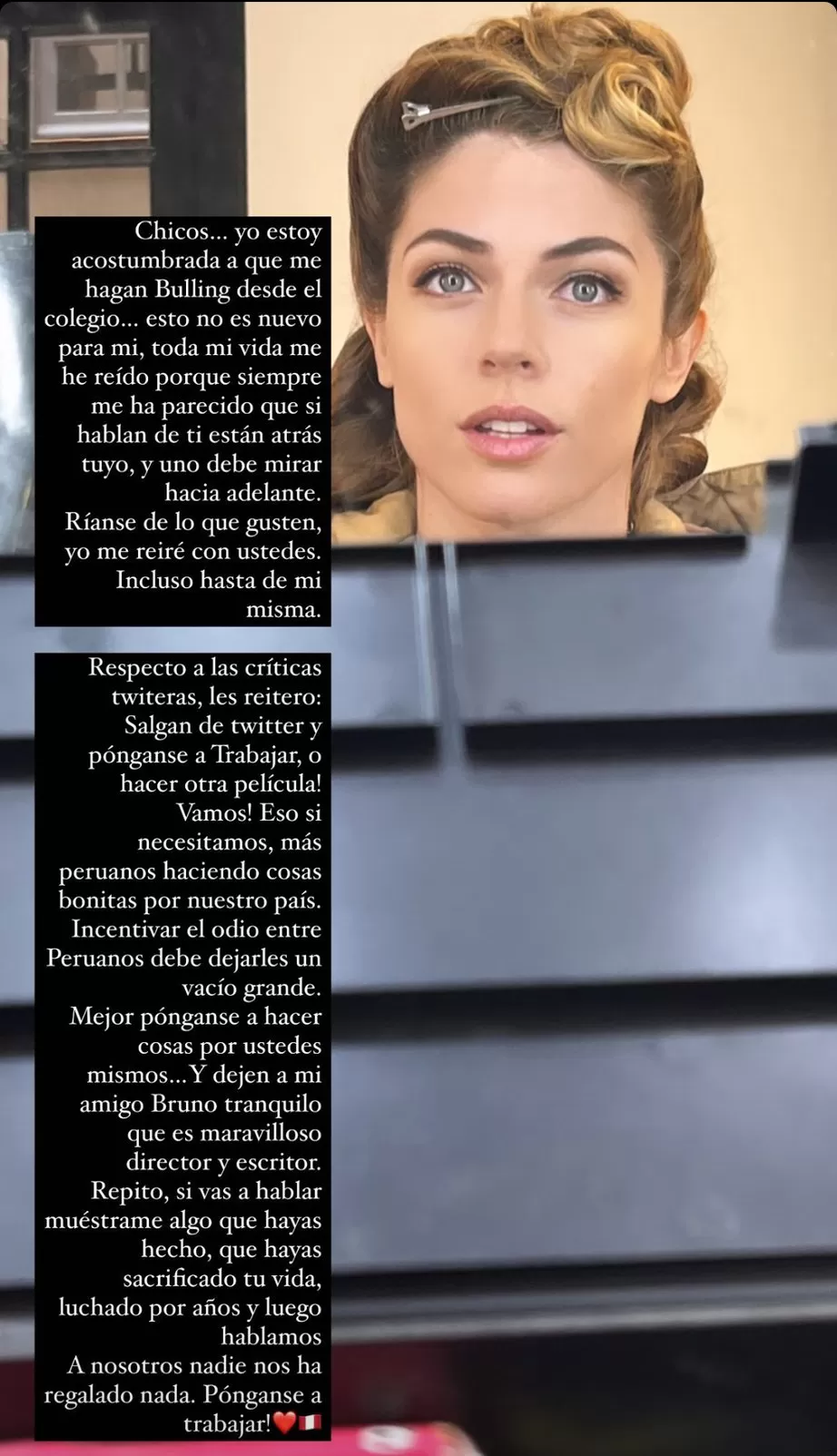 "Ríanse de lo que gusten, yo me reiré con ustedes. Incluso hasta de mí misma. Respecto a las críticas tuiteras le reitero: Salgan de Twitter y póngase a trabajar o hacer otra película. Eso sí necesitamos, más peruanos haciendo cosas bonitas por nuestro país. Incentivar el odio entre peruanos debe dejarles un vacío grande.