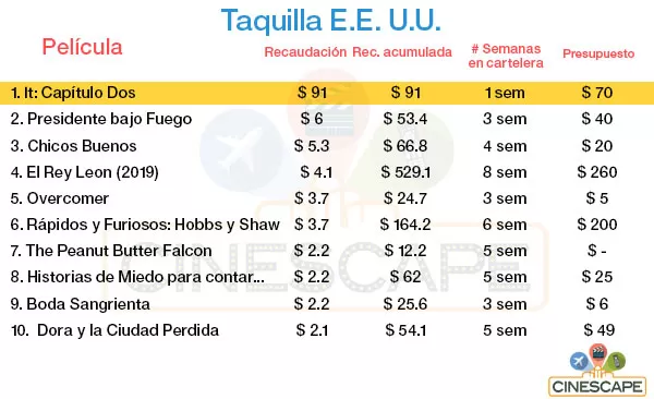 A pesar de haberse metido $91 millones al bolsillo en su primer fin de semana en su territorio local y $185 millones en total en todo el mundo, no le bastó para pasar la marca de la primera. Sin embargo, aquí hay que hacer algunas aclaraciones. La primera entrega logró recaudar $121 millones en su primer fin de semana en norteamérica y en todo el mundo alcanzó la suma total de $189 millones. Como vemos, la balanza esta vez se ha dividido de manera más equitativa entre la taquilla local e internacional aunque el presupuesto se haya doblado para esta segunda parte: It (Eso) del 2017 solo costó $35 millones pero ahora la secuela ha costado $70 millones.