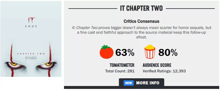 ¿Y cómo va respecto a las críticas? Pues tampoco ha podido igualar a la primera entrega. En el portal Rotten Tomatoes, It (Eso) del 2017 obtuvo un 86% de los críticos frente a un 84% de la audiencia, mientras que It: Capítulo Dos ha obtenido 63% de la crítica y un 80% de la audiencia.