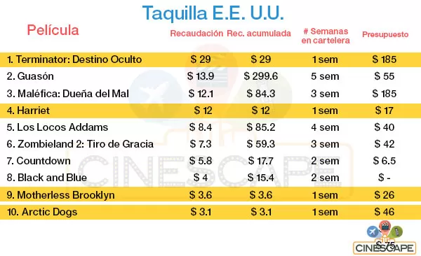 'Guasón' logró reconquistar el primer lugar de la taquilla norteamericana después de que 'Maléfica: Dueña del Mal' se lo quitase por una semana pero ahora es 'Terminator: Destino Oculto' quien logra liderar en la taquilla de los últimos días.