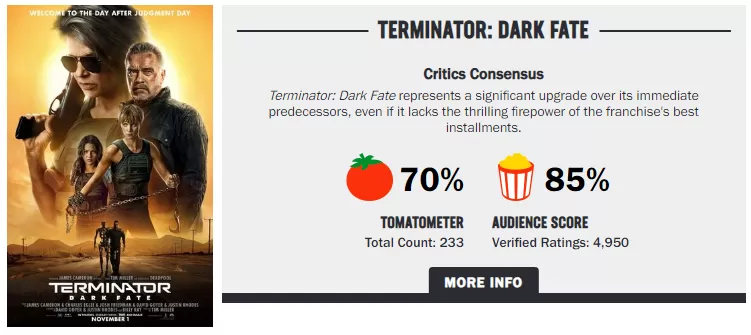 Así es, 'Terminator: Destino Oculto' no alcanzó los $30 millones en sus primeros días y respecto a la saga, se quedó con el segundo peor debut y solo logra superar al bodrio de 'Terminator: Génesis' (2015) que recaudó $27 millones en sus primeros días en los Estados Unidos pero que en todo su tiempo en cartelera logró sumar $440 millones. (El presupuesto de aquella cinta fue de $155 millones).