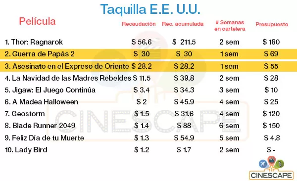 Por su parte, el tercer lugar es de Asesinato en el Expreso de Oriente, la adaptación cinematográfica de la célebre novela de Agatha Christie y que viene cargada de un elenco de primera. A pesar de debutar en la tercera posición, logró hacerse de unos sólidos $28.2 millones y con los datos de la taquilla internacional, asciende a $85 millones. Por aquí ya está en los cines.