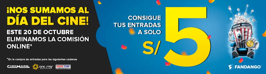 Celebrado a nivel nacional, el Día del Cine busca promover la industria cinematográfica a través de descuentos y promociones; es por eso que todas las entradas para cualquier película y cine, costarán solo 5 soles!!!! Los formatos especiales como 3D, 4DX, Prime y Platino estarán a mitad de precio.