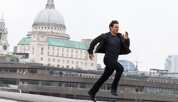 Las escena en cuestión nos muestra a Cruise corriendo a toda velocidad por la azotea, saltando de un techo a otro. La escena estaba diseñada para que Cruise no logre aterrizar con holgura, sin embargo, el actor toma la decisión de "suavizar el aterrizaje" poniendo su pie derecho, rompiéndose el tobillo al colisionar con la pared.