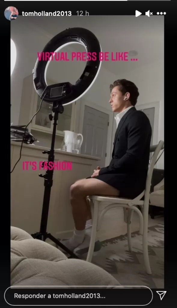 En la imagen que ha subido a sus historias, vemos que Tom se luce bien al saquito y camisa, pero como la parte inferior no entra en el encuadre, se tomó la libertad de andar en calzoncillos. El actor acompañó la instantánea diciendo: "Prensa virtual en plan... es moda". ¿Quién no la ha hecho?