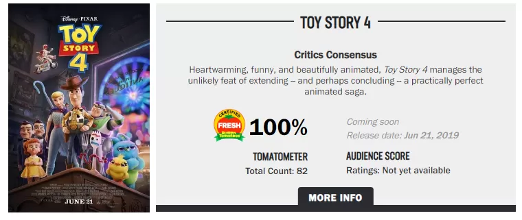 Queda menos de una semana para tener Toy Story 4 en los cines pero desde ya está disponible el porcentaje que recibe esta cinta en el portal Rotten Tomatoes y la excelente noticia es que ha debutado con una calificación perfecta.
