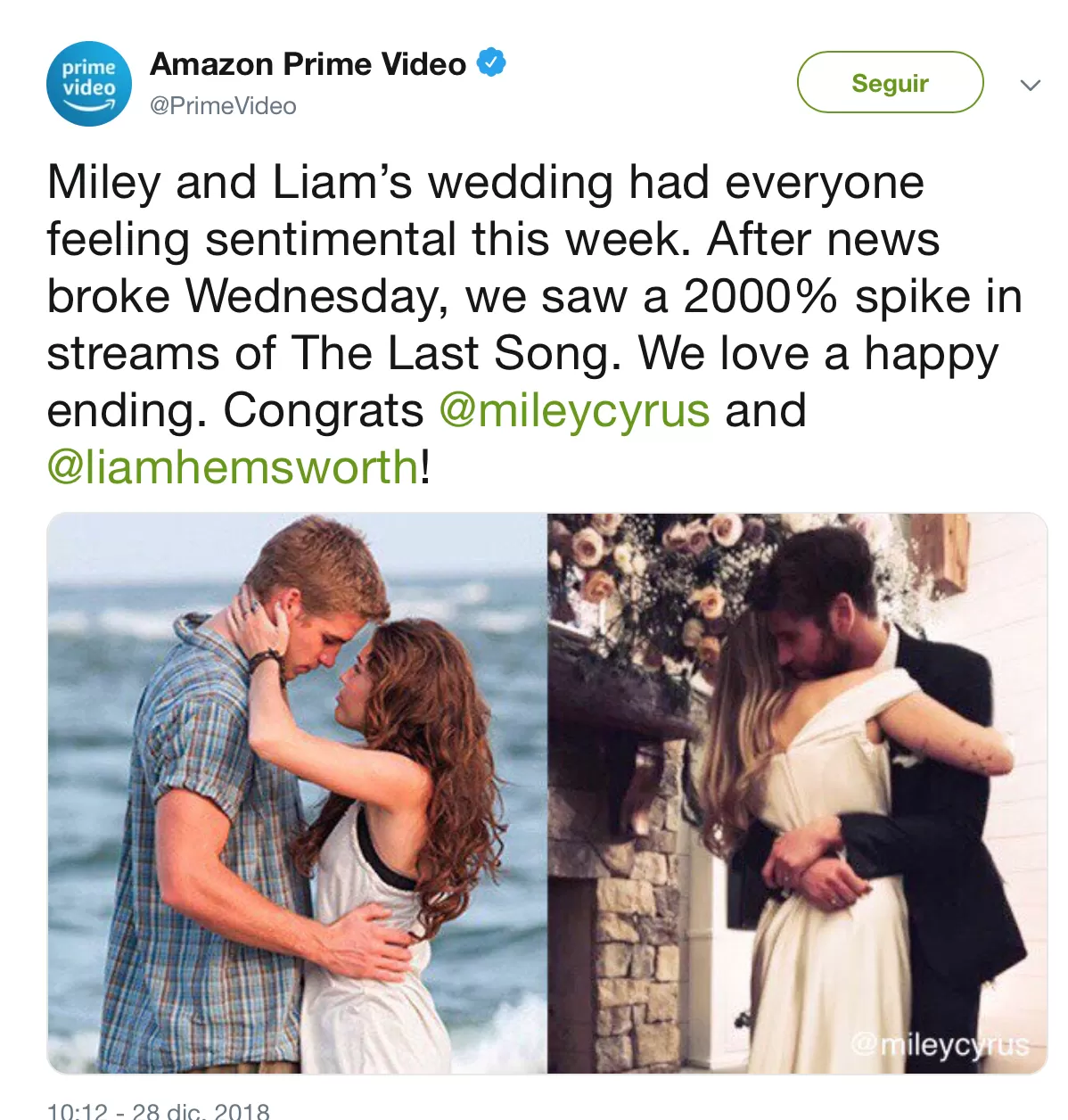 Si aún no te enteraste, la cantante Miley Cyrusha contraído matrimonio con el actor Liam Hemsworthel pasado mes de diciembre en una pequeña ceremonia familiar en Tennesee y este suceso ha sido de gran ayuda para la plataforma de streaming Amazon Prime Video.