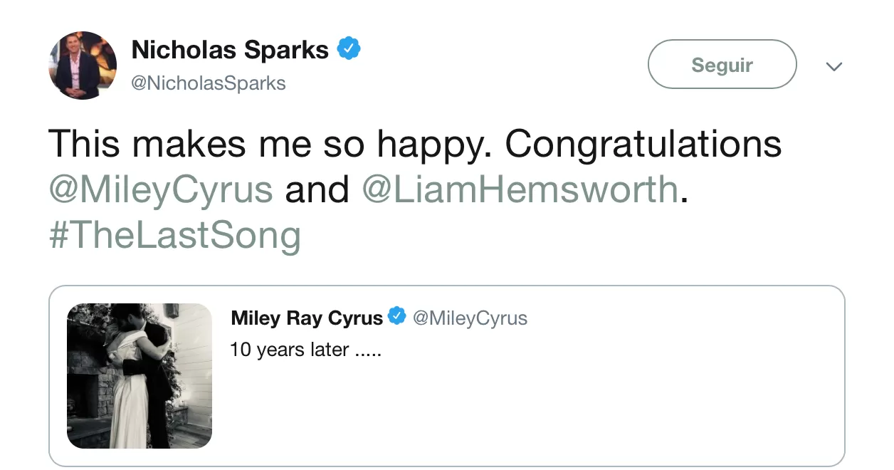 El autor del libro en el que se basó la película que comenzó todo, Nicholas Sparks,les envió un mensaje de felicitaciones en Twitter, destacando: "Esto me hace muy feliz".