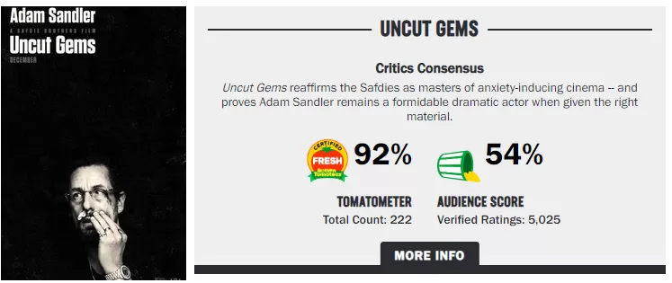 "Uncut Gems" de Adam Sandler dio qué hablar desde el momento en el que se presentó en el Festival de Cine de Toronto y el Telluride Film Festival, arrasando con los buenos comentarios de la crítica. De hecho, la cinta logró debutar en el portal Rotten Tomatoes con una calificación perfecta y si bien ha bajado su porcentaje, aún se mantiene en un sólido 92%.