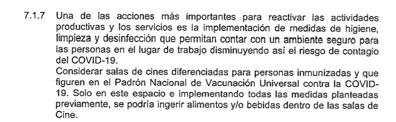 "Considerar salas de cines diferenciadas para personas inmunizadas y que figuren en el Padrón Nacional de Vacunación Universal contra la COVID-19. Solo en este espacio e implementando todas las medidas planteadas previamente, se podría ingerir alimentos y/o bebidas dentro de las salas de Cine".