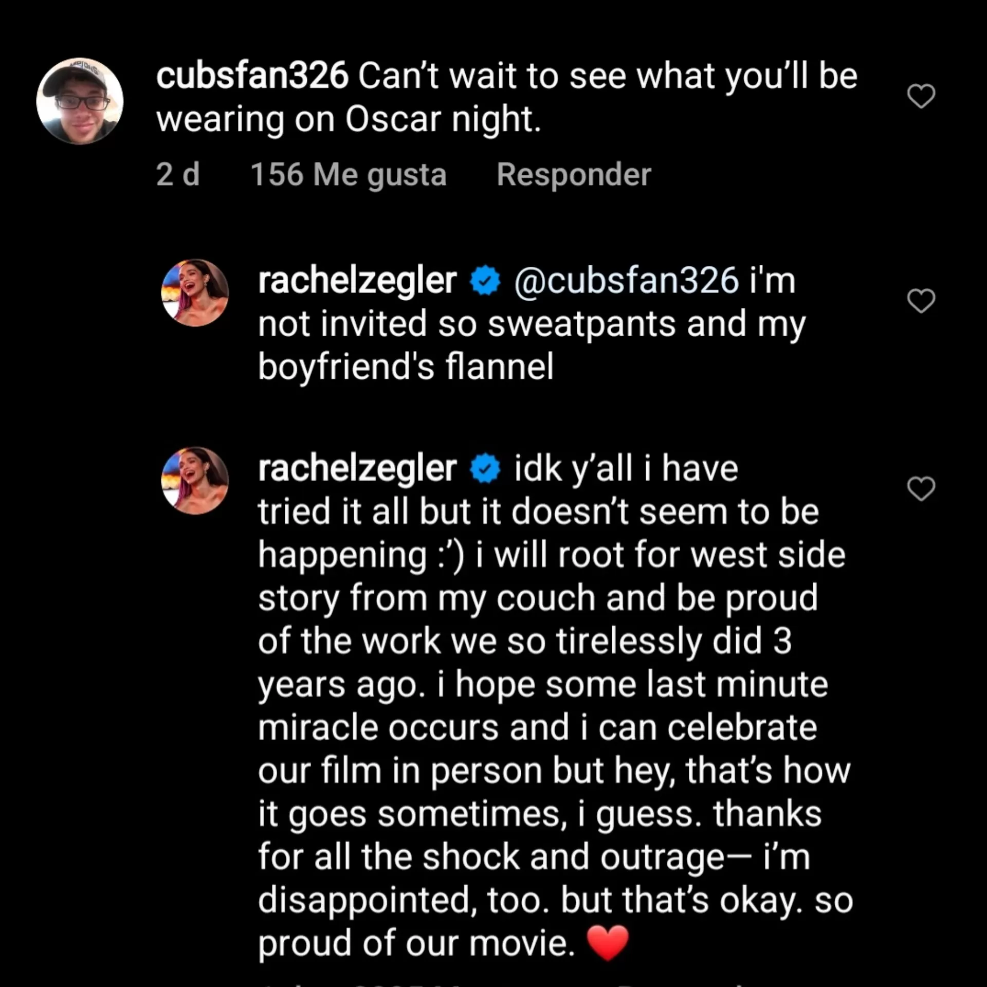“No estoy invitada, así que los pantalones de chándal y la franela de mi novio”, respondió Zegler en su comentario. Luego elaboró un poco más su respuesta ante la infinidad de reacciones de sus seguidores: