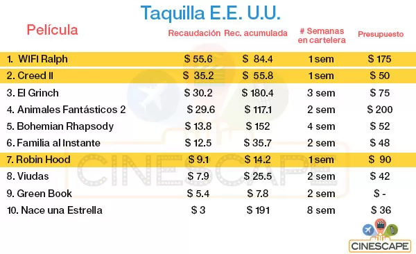 Además de algunos datos que compartimos hoy sobre la taquilla nacional, como todos los lunes (o casi todos) te mostramos las cifras de la taquilla norteamericana. Esta vez llegaron 3 estrenos a las salas, entre ellas WIFI Ralph, Creed II: Defendiendo el Legado y Robin Hood. ¿Cuál de las tres se impuso?