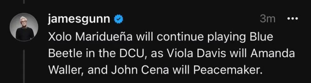 Ahora es el mismo Gunn quien hace la confirmación a través de Threads con un nuevo post que certifica que veremos a Xolo Maridueña en la próxima etapa de DC Films. Así como anunció respecto a Viola Davis y Joe Cena, quienes seguirán interpretando a Amanda Waller y Peacemaker, lo mismo ocurrirá con el personaje de Jaime Reyes y la interpretación del chico Cobra Kai.