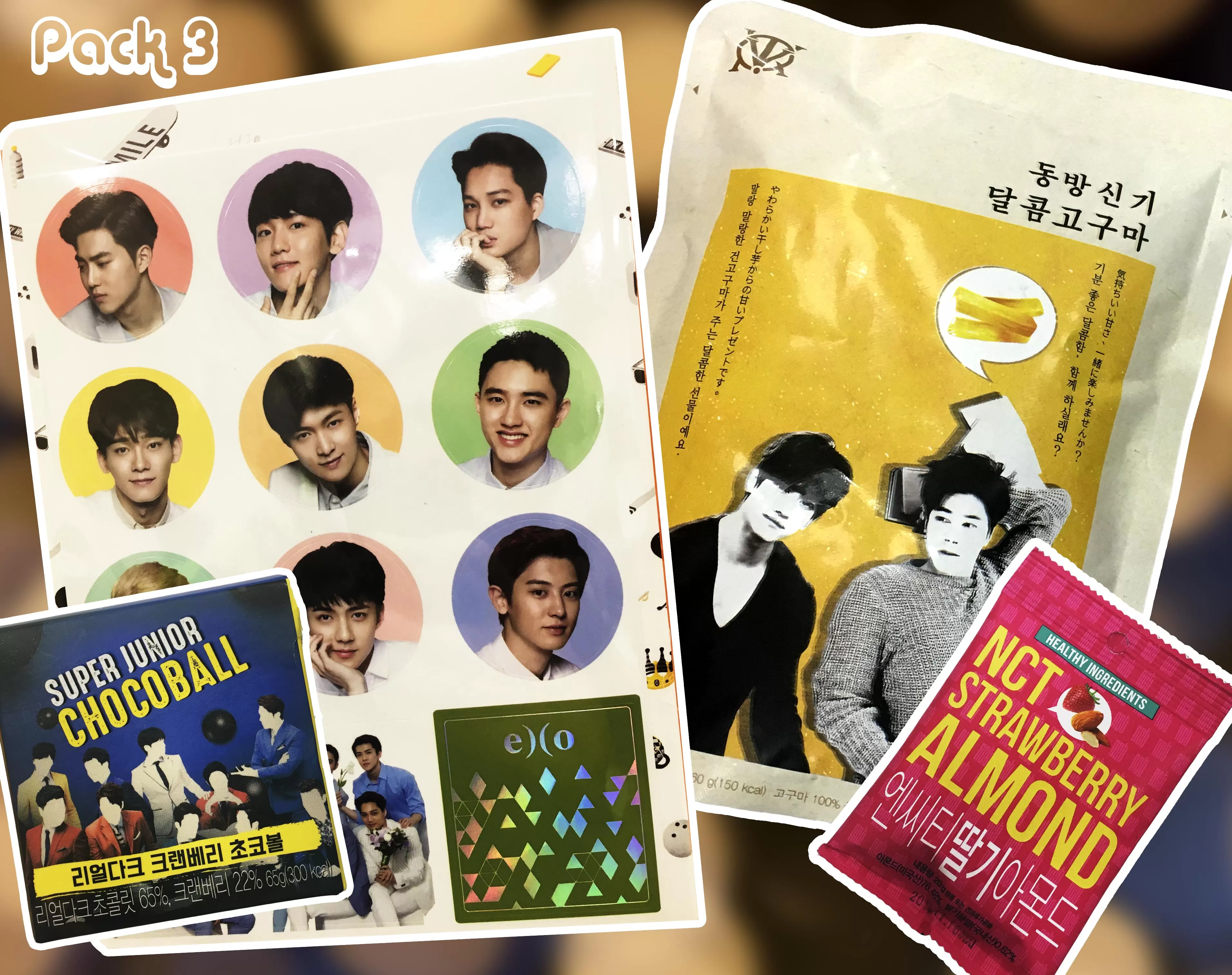 Pack 3: pack de stickers EXO y 3 snacks